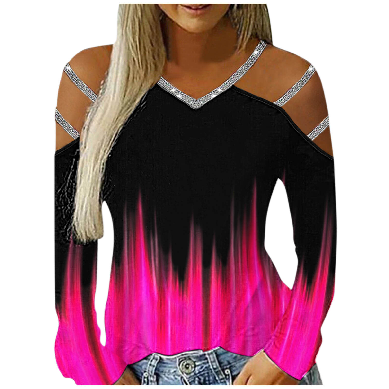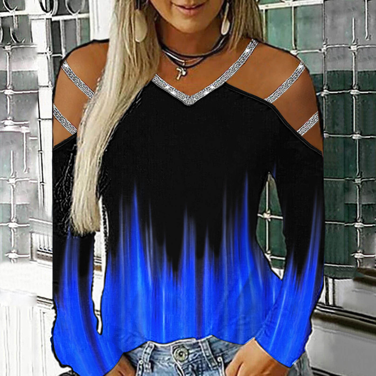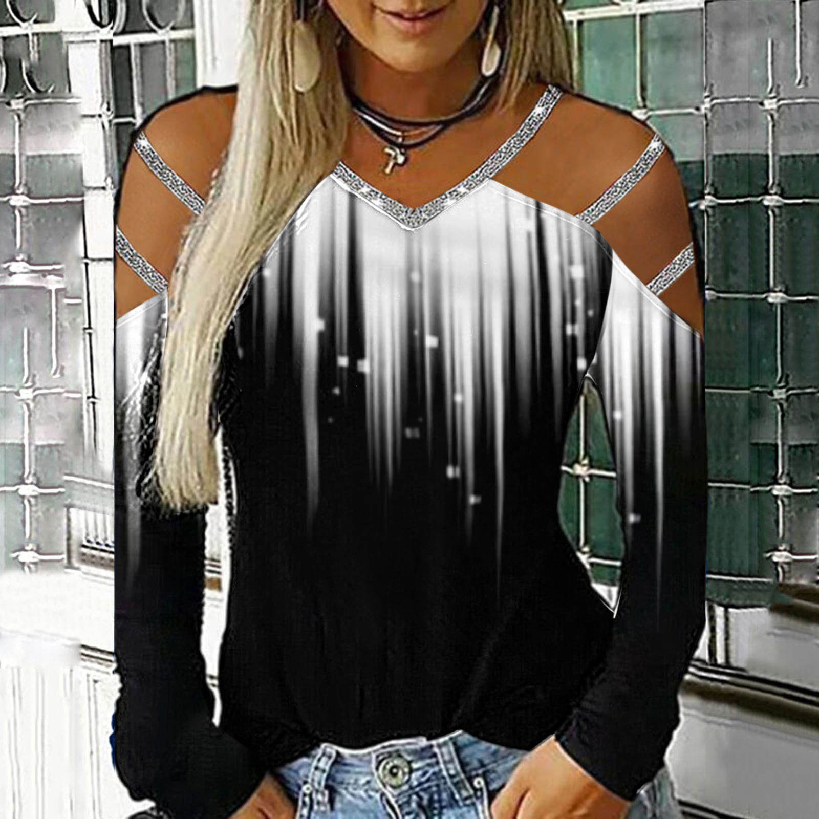 Gradient Printed Women’s Shirt Casual Loose Blouses Women Hollow Out Long Sleeves V Neck Off Shoulder Blousess Tops Women