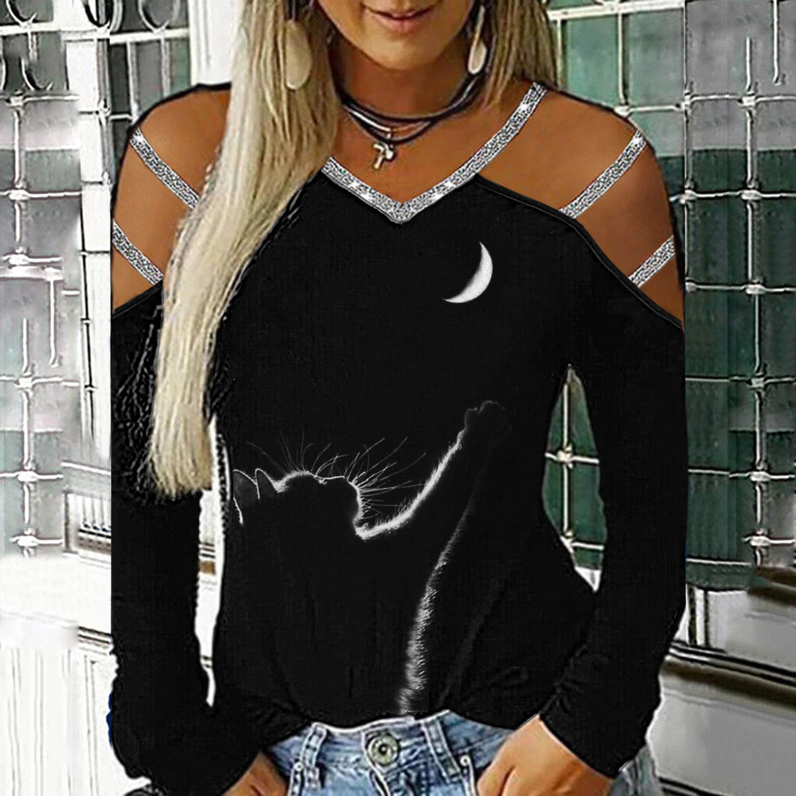 Fashion Women’s Casual Printing Hollow Out Long Sleeves V Neck Off Shoulder Tee Shirts Tops Blouse